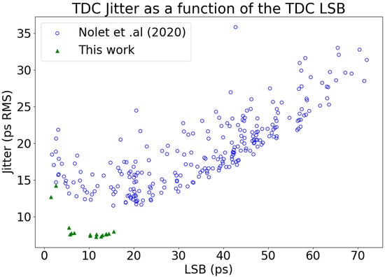 Jitter as a function of the LSB. The values from Figure 15 are compared to the results from Nolet (2020) [] and illustrate the decreased variation of performance between TDCs. For example, in Nolet (2020), the LSB of every TDC would vary from 2 to 72 ps. In this work, this variation is from 2 to 16 ps.