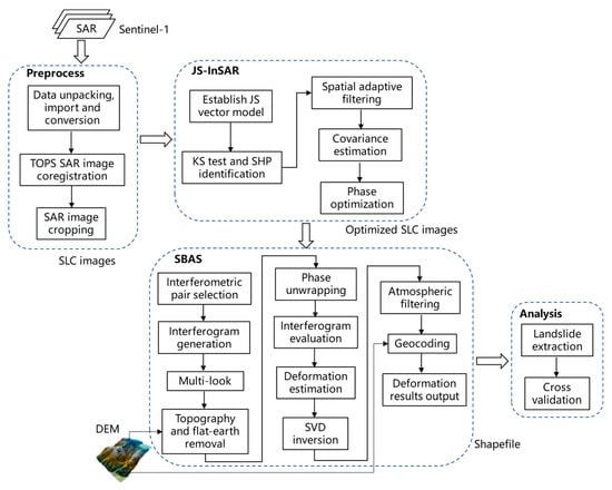 The landcover of the study region is dominated by dense vegetation, thus conventional InSAR methods are greatly affected by spatial and temporal decorrelation problems in this region. In this study, we proposed the JS-InSAR and SBAS combined method to improve the deformation monitoring results in these mountainous areas of southwestern China. First, the single-look complex (SLC) images were generated from Setinel-1 SAR images with TOPS [] mode SAR image coregistration method. Then, the SLC images were preprocessed using spatial adaptive filtering with JS-InSAR method, and the phase information of SAR images were reconstructed using an optimal estimator. In addition, SBAS InSAR was later used to obtain deformation rates through the analysis of a series of interferograms with small baselines. Finally, the landslide regions were extracted and analyzed based on deformation characteristics and visual interpretations. The flowchart of the whole processing chain is shown in Figure 3.