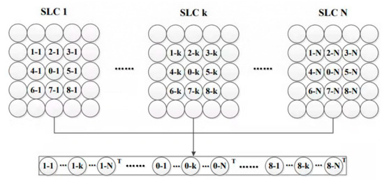 is the pixel stack, or a vector of complex values of the time series SLC images, i.e., , is the ith pixel in jth SLC. While the middle pixels x(n) are the processing units in this calculation, the phase values for x(n) are updated in the JS-InSAR processing. The joint data vector is shown in Figure 4.