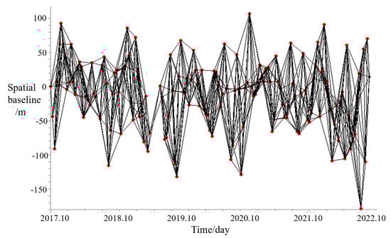 for N SLC images and M interferograms, the design matrix A will be M × N with only two elements 1 and −1 for each row, which define the interferometric pair relation. δφ is the unwrapped phase vector for all of the interferograms with size of M × 1. Before retrieving the real phase time series φ by inversion, the deformation rate and residual topography are estimated based on the linear relation between the phase value and the baseline. Then, the linear deformation phase and topography phase are removed from unwrapped phase, and the phase time series with single reference are obtained by residual unwrapped phase inversion with SVD inversion method. Finally, the residual phase time series are atmospherically filtered and converted into LOS displacement time series. Only the coherent pixels with high temporal coherence of residual phase can be seen as the reliable measurements. In the practical Setinel-1 SAR image processing, the multilook factor of 10 (range) and 2 (azimuth) were used in the interferogram generation, while the time and spatial baseline was set to 72 days and 200 m, respectively. An example baseline map of SAR dataset with track 26-2 is shown in Figure 5. The spatial filtering window is 16 × 16, and the temporal coherence threshold is 0.7.