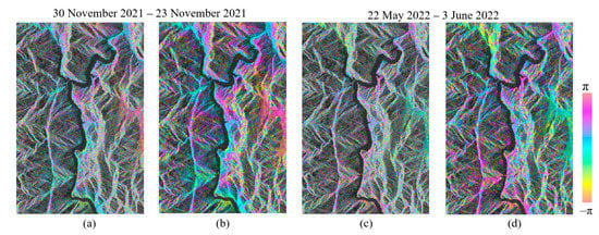 The differential interferograms with 10:2 multilook for parts of the track 26-2 with the interferometric pair of 30 October 2021 vs. 23 November 2021 and 22 May 2022 vs. 3 June 2022 in SAR coordinate. (a,c) Original phase, (b,d) JS-InSAR optimized phase.