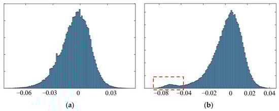 The histogram of the deformation results for (a) the proposed method and (b) SBAS.