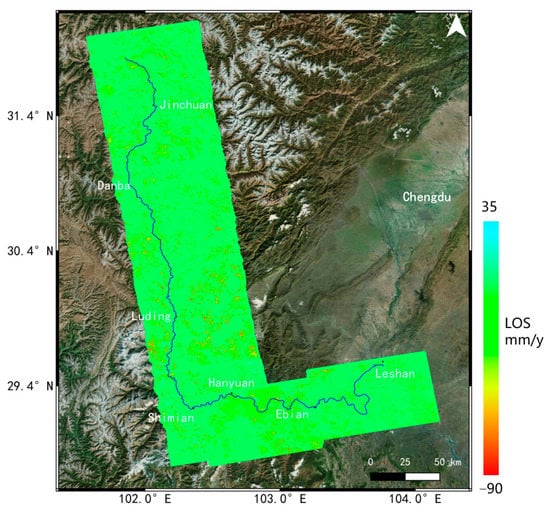 The annual average deformation rate for the Dadu River Basin from October 2017 to October 2022 was obtained using the SBAS method, as shown in Figure 9. The InSAR measurements in the figure were the high coherent scatterers in the SBAS processing, and the deformation results were along the line of sight (LOS) direction with color coding based on its values, while the positive or negative value represented surface displacement moving towards or away from the satellite, respectively. From the figure, we observed that the JS-InSAR method had extracted more ground targets in a complex environment, with the average point density of 1496/km2, thereby obtaining clearer and more accurate displacement information. Moreover, no obvious large-scale atmospheric or orbit errors were found in the deformation results, avoiding deformation overestimation and artifacts. The average deformation rate of the Dadu River Basin for 2017~2022 was −87.5~36.7 mm/year, with 85% deformation in regions located in the range between −10~10 mm/year, which proved that most of the areas in the Dadu River maintained a certain degree of stability. We also found that some landslide groups with large deformation mainly occurred in Danba, Luding and Shimian. However, some slopes along the river bank were affected by the SAR imaging geometry and alpine valley topography and could not be fully investigated due to the shadow and decorrelation problems.