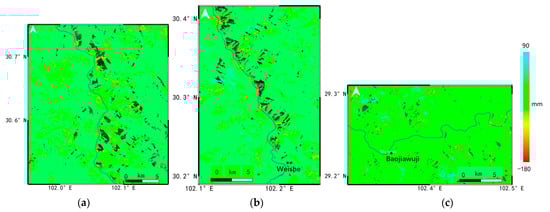 The displacement map for the Danba (a), Luding (b) and Shimian (c) Section (The blue line is the Dadu River).