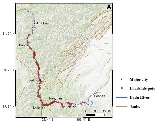 The Dadu River is located in the transition zone between the Western Sichuan Plateau and the Sichuan Basin in China, near the edge of the Eastern Qinghai–Tibet Plateau []. The river flows through four cities in Sichuan in an L-shaped trend, with a total length of 1074 km. Due to the strong tectonic uplift movements, the topography of this area is mainly controlled by the geological structure. Where three major fault zones (Xianshuihe, Longmengshan and Anninghe) and other small faults are intersected and compounded, the Dadu River Basin exhibits the typical features of the intensely eroded alpine canyon landform, with complex natural geological conditions, rich natural resources and fragile ecological environments. Influenced by the intense regional neo-tectonic activity and large variation in precipitation, this region has become one of areas with the most hazards on southwestern China with a high incidence of various geohazards, including landslides, debris flows, earthquakes and so on. Among those, more than 1700 landslides spread all over the basin have been investigated by geological survey [,,]. Moreover, the massive exploitation of mineral, forest and hydroelectric resources has promoted the occurrence of deep-seated landslides, threatening the safety of infrastructures and human life []. Therefore, the early identification of landslides in this region has become the focus of disaster prevention and mitigation for the local government, and constructing a map of geological hazards for the Dadu River Basin is of great significance to promote the efficiency of local geohazard monitoring and decrease the disaster losses.