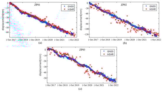 The comparisons between displacement time series and GNSS measurements of the Zhengjiaping landslide in the LOS direction for three stations: ZP01 (a), ZP02 (b) and ZP03 (c), respectively.