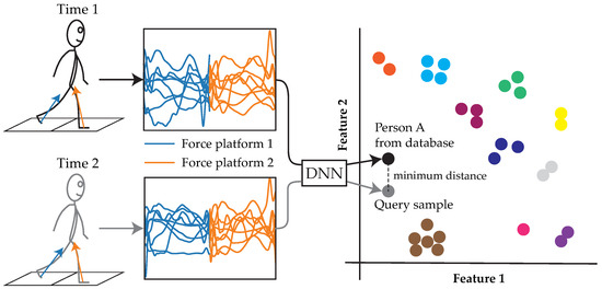 Despite the apparent prospect of force platforms as sensors for the re-ID task, there have only been a handful of studies in the field [6,14,15,16,17,18,19,20]. All of the recent works implemented machine learning classification models that were trained and evaluated at ‘many-shot’ (or subject-dependent [21]) re-ID, whereby the training set contains ‘many’ samples from the identities (IDs) that are encountered in the test set. If one of these models were to be deployed, they could only re-ID those who were included in the training set. This is a significant limitation given that IDs may be introduced or removed from the database upon deployment in many applications. In contrast to this, is the more challenging and general ‘zero-shot’ (or subject-independent [21]) re-ID, whereby the training set contains ‘zero’ samples from the IDs that are encountered in the test set (i.e., the training and test sets contain discrete IDs). Zero-shot re-ID can be achieved using deep metric learning (DML); that is, the utilization of a deep neural network (DNN) to learn a feature representation that, when compared between samples using a distance metric, is similar between samples from the same category (i.e., the same ID) and dissimilar between samples from different categories (i.e., different IDs) [22,23] (Figure 1). Using this matching approach, any number of IDs, not seen during training, can be re-identified at test time, provided that there is at least one prior sample. Thus, the implementation of DML would increase the scalability of force platform-based re-ID systems.