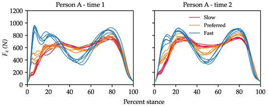 An example of the vertical ground reaction force () with changes in walking speed (colors) and footwear (left vs. right) between measurement instances. Left—women’s ankle boots (flat sole); right—ballet flats.