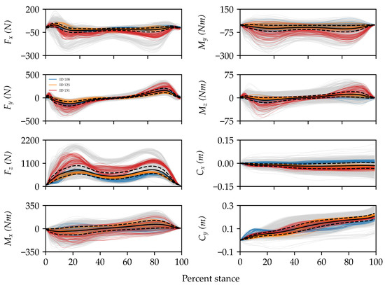 Visualization of all ground reaction forces (—mediolateral, —anteroposterior, and —vertical), ground reaction moments (, , and ), and center of pressure coordinates ( and ) for three random IDs in the dataset (colors) compared to the rest (grey). Solid and dashed black lines are the means and standard deviations across the entire dataset, respectively. For ease of interpretation, the signals have been clipped, filtered, and time normalized to 100% of the stance phase. Overall, there is a large degree of variability in the dataset, and some components are more variable than others.