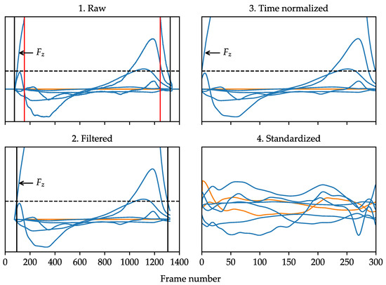 - All signals were time normalized via linear interpolation to time synchronize events within the stance phase and reduce the dimensionality of inputs. A temporal resolution of 300 frames was selected as a conservatively high value, given that a prior study found minimal difference between 100 vs. 1000 frame inputs in a related gait classification task [48].