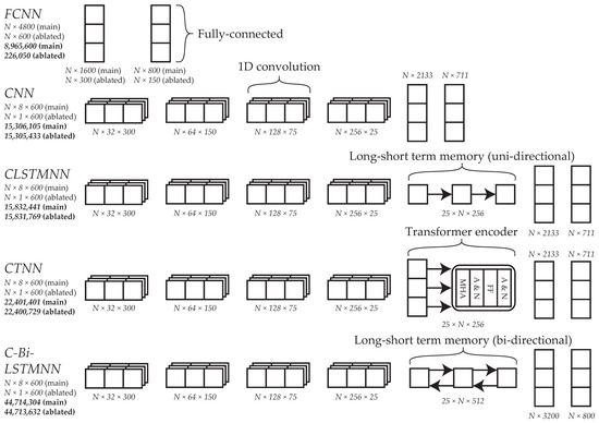 Overview of the DNN architectures used in this study. Shown on the left is the name of each architecture, the shape of its input, and its total number of parameters (top-to-bottom, respectively). The shape notation is number of samples number of features F for the fully connected neural network (FCNN) and number of samples number of channels sequence length L for the others. CNN = convolutional neural network, CLSTMNN = convolutional long short-term memory neural network, CTNN = convolutional transformer neural network, C-Bi-LSTMNN = convolutional bi-directional long short-term memory neural network.