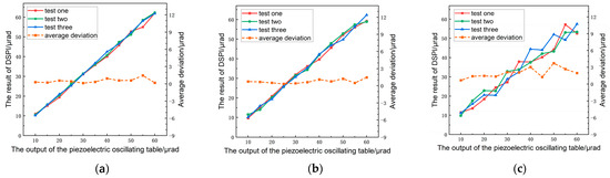 The pitch angle, yaw angle, and roll angle were simultaneously loaded by driving the six-axis piezoelectric oscillating table. The angle-loading ranges of the pitch angle, yaw angle, and roll angle set in the test were within 10–60 μrad, respectively. The three angle channels of the piezoelectric oscillating table were controlled to output the same angle value simultaneously, with a loading step of 5 μrad. Finally, a total of 11 data points were obtained, and the measurement process was repeated three times to obtain three sets of repeated test data. The measurement results and average deviation are shown in Figure 5.