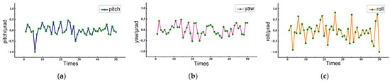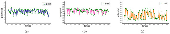 Simultaneous measurement results: (a) the measurement values of pitch, (b) the measurement values of yaw, (c) the measurement values of roll.
