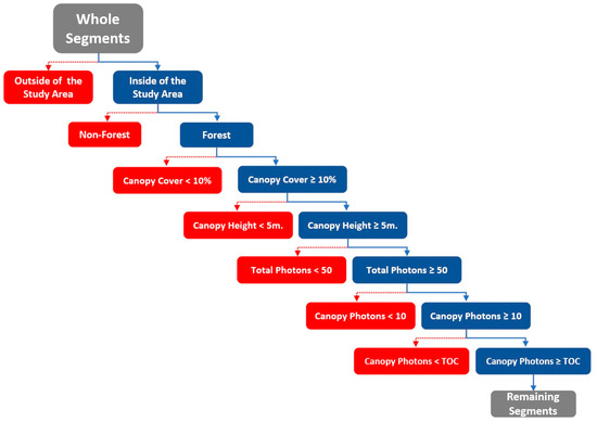 Figure 2. The flow chart depicts the filtering process of ATL08 segments, where red boxes represent filtered segments and blue boxes represent the remaining segments.
