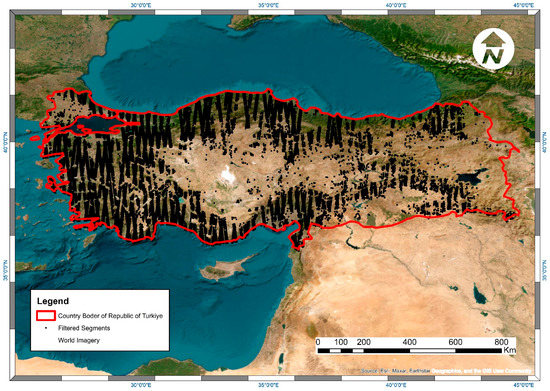 Distribution of filtered segments across the study area (ESRI World Imagery Basemap).