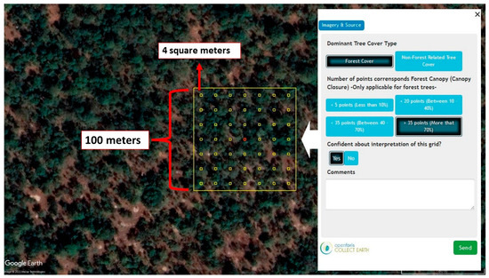 Two different methods were employed to assess the accuracy of the obtained canopy cover product. First, an accuracy assessment analysis was performed with 30 percent of filtered ATL08 segments separated from training data. Then, visual interpretations were made at randomly distributed 100-m resolution grids (2000 grids) within the study area with the help of Collect Earth software to validate the CCEM. Collect Earth is a software that enables systematic reference data collection via high-resolution imagery through Google Earth and GEE [57,58]. Each visual interpretation grid consists of 49 small squares of 4 square meters within a 10,000 square meters area which is exactly the same cell size and the geographic location as the pixels of the output canopy cover map (Figure 5). This methodology is based on counting small squares that contain the top of a tree using Google Earth imagery to decide the canopy cover class visually. After the counting process, the necessary information must be entered on the identification card seen in the right part of Figure 5. All this visually gathered canopy cover information was collected in the software, and then the accuracy metrics were calculated with a statistics tool called Saiku Analytics [57]. For a more comprehensive understanding of this accuracy assessment method, interested readers can consult a relevant sample study in the literature [59].