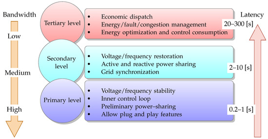 The primary level regulates the network’s frequency and voltage, ensuring power-sharing between the distributed generators (DGs) [2]. The most important approach is the droop control [3], which is based on the droop features of a conventional generator. Droop control ensures stability between frequency or active power () and voltage or reactive power (). The secondary level stabilizes the voltage and frequency deviations due to the output impedance decoupling, failures in power-sharing or the presence of circulating currents [4]. At this level, sharing information in real time between the DGs and supporting the stability of the most critical control variables within their nominal values is essential.