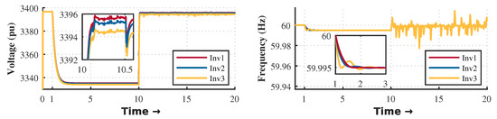 where refers to average voltages broadcasted from each DG at the sampling time. Small signal representations of the frequency and voltage for secondary control are detailed in [63].