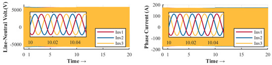 Power sharing between DGs is usually carried out by parallel inverters connected to a common AC bus with multiple loads [42]. The proposed controller in this paper considers the microgrid as three Voltage Source Inverters (VSI) feeding an RL load at the point of common coupling. An RL load was chosen to study the microgrid’s active and reactive power sharing. Each DG represents a power source implemented in The Simulation Platform for Power Electronic Systems (PLECS) [43,44]. Droop control in parallel inverters is a widely used strategy to regulate MG power sharing. The main goal of primary droop control is to set a proportional load sharing among DGs, based on the well-known (P-Q) droop method [5]. Each inverter has an external droop control loop to improve performance and provide a decentralized control method. Figure 2 shows the strategy applied to regulate frequency and voltage for one VSI. The details of hierarchical control can be found in Appendix A and Appendix B.
