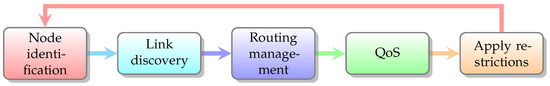 SDN controllers implement different modules to handle the most relevant aspect of the communication devices. These modules afford key functionalities, such as selecting the best route for message forwarding, monitoring topology changes, and enhancing security [46,47], as outlined in Figure 5. The process starts with discovering and managing the nodes, finding the active communication links, and updating functions accordingly. Next, optimal packet flow and routing management are established by creating new flows and forwarding packets. The controller must activate the functions to monitor the traffic and guarantee the quality of service (QoS) according to predefined metrics. Finally, several options are applied to ensure network management and security, avoid latency issues, and improve restrictions imposed by the power system.