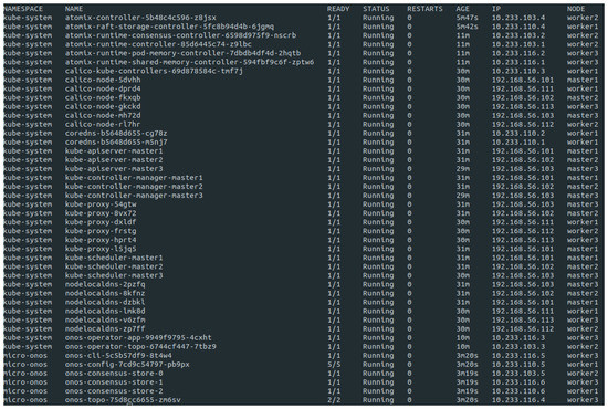 Figure 8 shows the deployment of the pods during the execution of the in the topology. Five pods of the onos-config service are deployed, and six pods of Atomix increase the availability and distribute the services across the nodes. All steps to deploy this proposal are available in the GitHub repository [57].