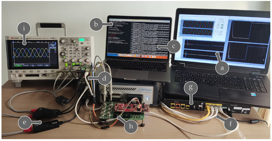 Experimental setup for Kubernetes cluster with Raspberry pi: (a) PLECS output, (b) ONOS command line interface, (c) SDN flows during communication, (d) Raspberry pi Kubernetes cluster, (e) USB network adapter, (f) overlay interface, (g) Cisco router and 52switch, (h) SPI connection, (i) MG output current.