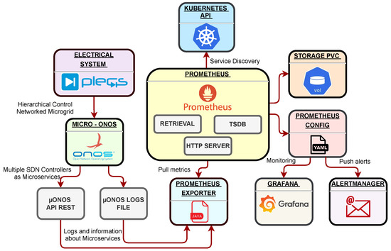 The solution to monitoring the communication devices’ status and the tools’ interaction is presented in Figure 11. Our proposal uses a Rancher Helmchart to develop a Java application (Prometheus Exporter) to obtain information about network metrics. Furthermore, it exports the data to Prometheus, which is responsible for monitoring events and triggering alerts according to standard conditions.