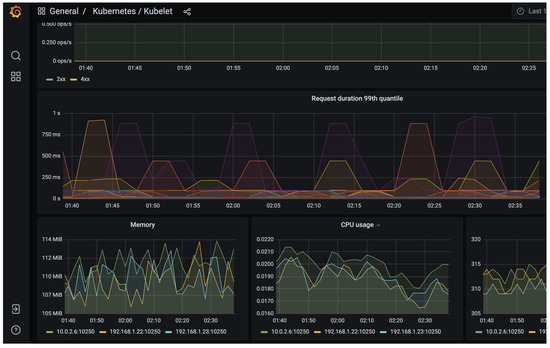 Different factors, such as hardware resources, load, or communication architecture, limit the number of pods executed on each device. However, with Rancher, these pods can be scaled automatically without compromising the cluster’s overall structure. To configure automatic scaling in Rancher is necessary to select the deployment. From there, the “Scaling” tab specifies the minimum, maximum, and desired number of replicas for the deployment and also sets the scaling policy based on CPU or memory usage. This proposal shows the number of replicas for each service in Figure 8, with the boundary for scaling new pods set at 80% of CPU usage. It’s important to note that automatic scaling requires a monitoring and metrics system to track your deployment’s resource utilization. Rancher integrates with Prometheus and Grafana to trigger alerts according to the threshold values configured. Finally, the Grafana graphical user interface allows monitoring the deployment’s status and the number of replicas scaled.