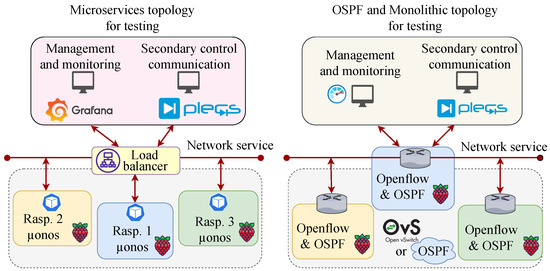 Figure 6 presents the proposed topology and considers the aggregation of microservices deployed in three Raspberry pi 4 (with ARM architecture). Given the increased computational capacity of the latest versions of Raspberry and its lower cost compared to other computing devices, this platform is selected to operate as a worker in the Kubernetes cluster and an OpenFlow communication device. OpenFlow is a communication protocol SDN uses to standardize the interfaces between the control and data planes [48]. This research uses OpenFlow because it is a standard supported by multiple communication devices, adding great flexibility and programmability to the network. The flexibility of OpenFlow minimizes the effort and resources necessary to manage complex networks, including those in microgrid hierarchical control.