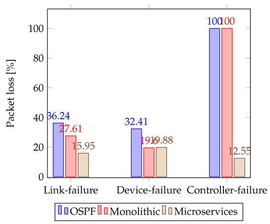 One promising approach is to distribute the functions of the SDN controller into multiple microservices [16,17]. The goal is to implement these functions as distributed units with a replication factor for redundancy. By doing so, the workload and resources of the SDN controller are spread among different worker nodes. In the event of a failure, the data remains accessible through the microservice controller without requiring manual intervention.