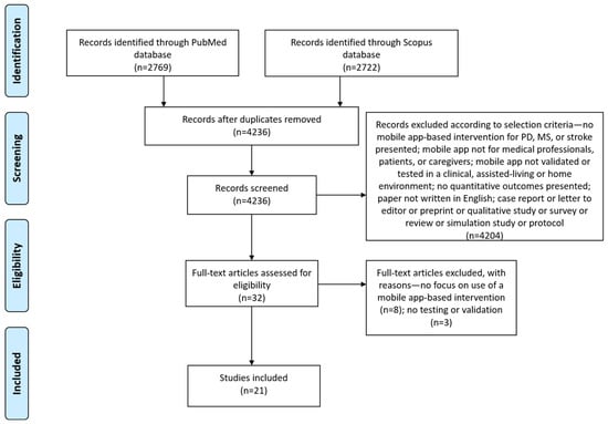 Our last search in July 2021 identified 2769 articles from the PubMed database and 2722 articles from the Scopus database. All retrieved records were imported in the Mendeley citation management software, which identified 1255 duplicates. We screened the abstracts of the remaining 4236 articles according to our inclusion and exclusion criteria, and 32 articles were found to be eligible for full-text screening. After reading the full text of the articles, the authors agreed to include 21 articles in the review. Most studies targeted patients with stroke (14 studies), followed by studies targeting MS (4 studies) and PD (3 studies). The screening procedure along with reasons for excluding articles are depicted in the PRISMA flow diagram in Figure 1.