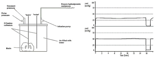 Prior to regulatory approval, most ICP sensors undergo routine laboratory “bench testing” to confirm their performance relative to manufacturing specifications for zero drift standards and overall measurement accuracy. An example of this is the Cambridge experimental bench test procedure, described in Figure 5, which mimics CSF and physiological compliance [40].