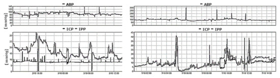 Head-injured patients often exhibit abnormal ICP dynamics. Elevated ICP interferes with cerebral blood flow (CBF), cerebral perfusion pressure (CPP), and cerebral compliance (Figure 1) [14,15,16]. Highly elevated ICP can result in cerebral ischaemia or herniation [14,17,18,19].