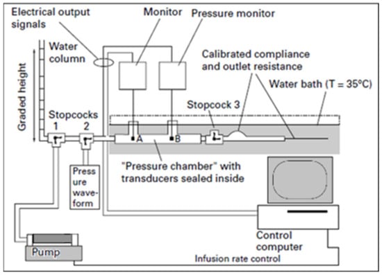 Bench Test Procedure: A bottle is filled with deionised water, leaving 20 mL of air to be removed during dynamic catheter testing. The bottle is then submerged horizontally in a water bath at a constant temperature of 35 °C. Static pressure on the bottle (representing pressure detected by ICP catheters) and reference static pressure (representing true ventricular pressure) are compared by changing the height of a water column in a 1.5 m graded vertical tube. Static pressure is released at intervals by allowing the water to flow out of an opened stopcock; conversely, pressure is increased by infusing fluid into the tubing [34,41].