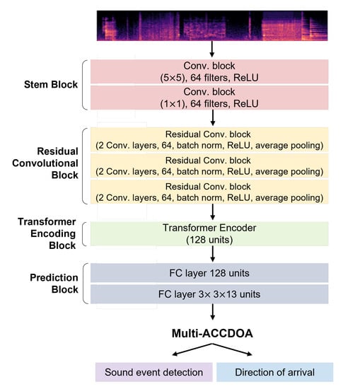 The structure of the proposed model is shown in Figure 1. The proposed neural network model is based on the RCNN structure. RCNN is an advanced form of residual network (ResNet) that uses residual blocks, which have the same input and output dimensions and add the input values to the output values, to minimize information loss []. In our proposed method, the stem block is formed using convolutional blocks to utilize the RCNN structure of the model. Here, the kernel sizes of the convolution block are 5 × 5 and 1 × 1. The residual block comprises a convolutional neural network (CNN) layer with residual connections, batch normalization, and a max pooling layer. The structure of the residual block is shown in Figure 2. The CNN with residual blocks utilized a kernel size of , and a total of three layers of residual blocks were used. Then, the transformer encoder and fully connected layers are formed. The hyper tangent is used as an activation function. The transformer encoder is a sequence model that preserves the positional information of input data and can simultaneously learn all positional relationships in the input sequence. Unlike recurrent neural network (RNN), it does not require sequential processing, which makes it faster, and can achieve better performance than RNN when the input sequence is long []. The attention model used in the transformer encoder of the proposed model employs multi-head attention. For the hyperparameters, we set the encoder dimension to 128, the number of layers to 1, the number of heads to 4, and the dimension of the feedforward layer to 256, 512, 1024, and 2048. The hyper tangent is used as an activation function. Finally, a single model with a single branch is trained and Multi-ACCDOA is applied as the final output format since SELD is performed for overlapping sources. The format is defined as follows: