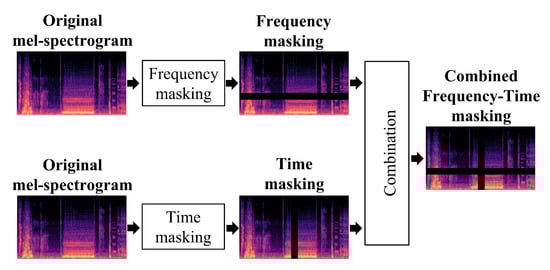 Furthermore, the SpecAugment data augmentation method, widely used in speech processing, was employed []. Two types of masking were applied in SpecAugment: frequency and time masking. In frequency masking, consecutive frequencies of a spectrogram are randomly masked. Time masking is similar to frequency masking; however, consecutive time frames of a spectrogram are randomly masked. The spectrogram with two masking applied is shown in Figure 3. SpecAugment was randomly applied to each batch of input data. Time masking could be applied to the entire sequence, with a width of 8 frames, masking roughly 0.02 s of time information per batch. Frequency masking is also applied to the entire sequence, with 8 mel-bins masked out of a total of 64 mel-bins.