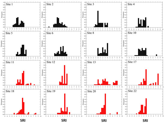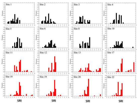 The distribution functions of the SRI for each site are displayed in Figure 8, and their mean values are shown in Figure 9.