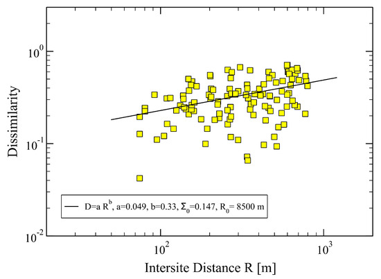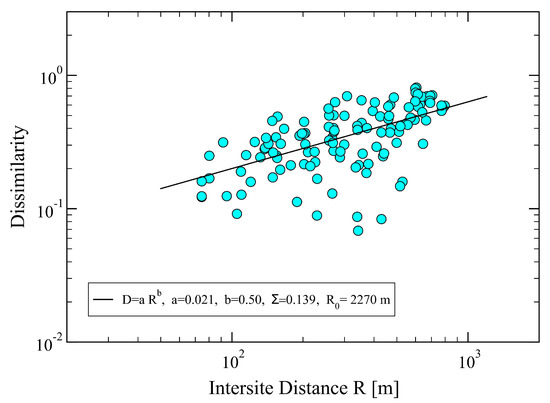 Dissimilarity, , between two sites, () vs. inter-site distance , obtained from Equation (2) using the initial set of parameters . The full squares are the empirical data, and the straight line is a least-square fit with the power law , yielding , corresponding to m, and . Specifically, we find and . The total error of the fit is . The mean inter-site distance in the network is m, the minimum and maximum ones: m and m, respectively.