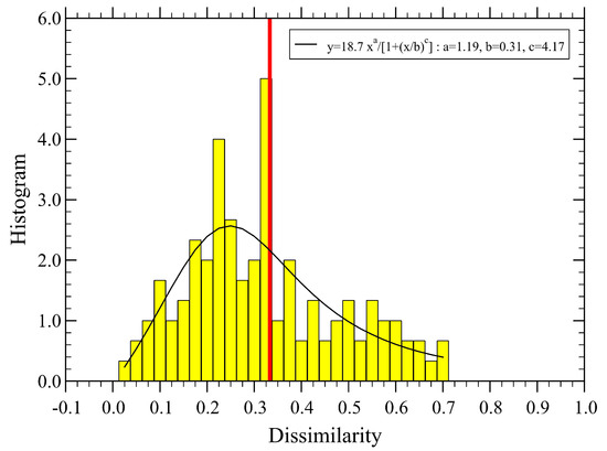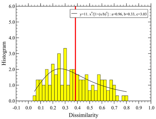 Probability density distribution of dissimilarity, corresponding to the values used in Figure 6. We find (vertical red line). The continuous line is a fit with the form , with the normalization constant and the fit parameters , and .