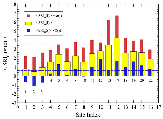 Finally, we plot in Figure 5 the mean SRI values at each site, obtained from Equation (1) and corresponding to the parameter set: and . We note that all mean values turn out to be positive, ⟨SRI⟩ , and they are not quite consistent with the scenario expected from Table 3. This observation actually motivated us to search for a way to improve on this quality scenario results. The idea is then to search for a “better” set of parameters that can bring us beyond our initial guess, thus eliminating the arbitrariness endowed in our parameter values.
