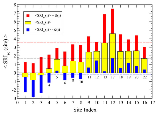Mean ⟨SRI⟩ obtained by averaging the index over the 70 temporal values for each active site (yellow bars). The red and blue bars display the one variations of the data at each site i, above and below the local mean values, respectively. The dashed lines represent averages over all sites of the three set of data. We find ⟨SRI⟩ = 2.14, ⟨SRI⟩+ = 3.68, ⟨SRI⟩− = 0.60, with . The actual site identification numbers are reported just below the zero line: (1–6, 8, 10–13, 17–20, 22).
