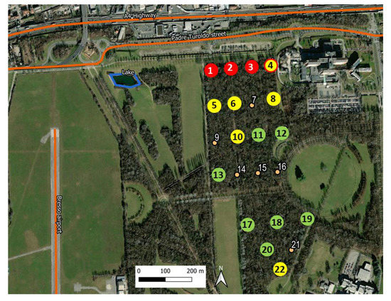 The Parco Nord (Northern Park) area of study. The sensor network is indicated by the numbered dots (1–22), deployed inside the tree-covered zone of the park. The network consists of two regular grids, the northern and the southern ones, composed of 16 and 6 nodes, respectively. Those in red color are the actually used sensors (total number 16), while those in yellow are the six ones discarded due to malfunctioning. One can see the A4 highway, the Padre Turoldo street and the artificial lake to the northern part of the park, while to the west side of it, the small Bresso airport runaway is located.