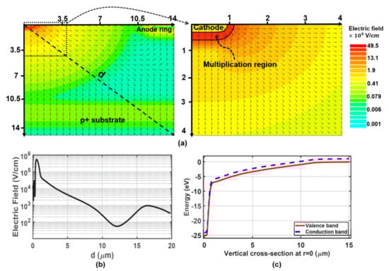 The electric field extends but lowers by moving radially away from the cathode towards the substrate, towards the anode ring and in a “diagonal” direction, as shown in Figure 2b. For example, at a “diagonal” distance of d = 10 μm from the origin of coordinates, the electric field is still ∼200 V/cm. Figure 2c shows the energy band diagram along a vertical cross-section at r = 0 μm. According to the energy band diagram when a photon is absorbed in the detection region, the generated electron and the hole are promptly separated by the electric field (drifting in opposite directions), and then, the electron drifts into the direction opposite to the electric field vector arrows towards the small multiplication region. This figure also shows that the reverse voltage of 24.5 V splits into about 7.5 V over the thick absorption region and 17 V over the multiplication region. In fact, due to the existence of the lateral component of the electric field, the peripheral carriers also have a chance to reach the multiplication region, where they can start impact ionization. Therefore, the whole diode area acts as the detection zone, which results in a large light-sensitive area. In addition, the drift-based carrier transport mechanism enhances the detector’s speed performance.