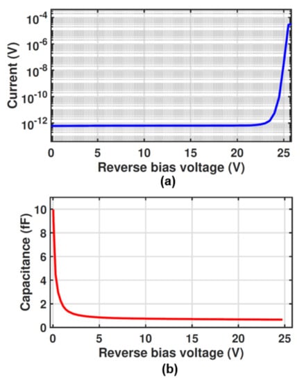 The total capacitance of the MD-APD includes the capacitance of the p-n junctions of all single cathode dots and the parasitic capacitance of the metal tracks used to connect the cathode dots. The high capacitance of 220 fF at the zero voltage originates from the junction capacitance of the cathode dots which was estimated to be about 10 fF from the TCAD simulation result for SD-APD (see Figure 3b). As the reverse bias voltage increases, the capacitance decreases rapidly to 27 fF, of which 16.25 fF can be estimated as the junction capacitance of the cathode dots (25 × 0.65 fF), and the 10.75 fF left can be attributed to parasitic metal track capacitances. It is worth noting that the advantage of the low capacitance of this APD is significant for designing an optical receiver with a high data rate. Because in the design of the transimpedance amplifier (TIA), one critical factor limiting the bandwidth is the diode capacitance.