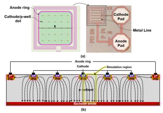 Figure 4 shows the top view (a) and a 2d schematic cross-section (b) of the multi-dot APD (MD-APD) fabricated in the XO035 CMOS technology. The MD-APD is an array (5 × 5) of single-dot cathode/p-well structures, where the single cathodes are connected with tracks in metal layer 4 with a minimum width of 0.6 μm as shown in Figure 4a. The p+ substrate is used as a shared backside anode. In addition, the dot cathode array is surrounded by a surface anode where the electric field of the boundary dots terminates, and defines the size of the diode. The APD is covered by the standard isolation and passivation stack to protect the fabricated device from environmental influences.