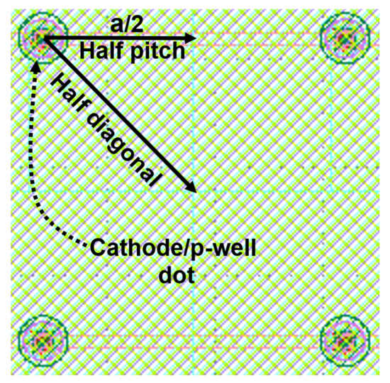 Based on this approach, the active area can be easily enlarged by expanding the cathode dot array. In fact, the active area can be enlarged by increasing the number of cathode dots arrays and also by increasing the distance between the cathode dots (i.e., the array’s pitch size). However, the pitch size of the array is an important parameter that affects the performance. Figure 5 is a zoomed top view of a cathode/p-well dot adjacent to other cathode/p-well dots in the array to visualize a half pitch and a half diagonal from the cathode center. The slowest response is expected if a photon is absorbed exactly in the center between four cathode/p-well dots, because this is where the longest drift distance along the silicon surface appears. This maximum lateral drift distance is , where a is the pitch of the n+/p-well dot array.