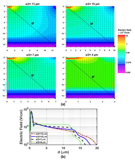 We used TCAD simulations with ATLAS to estimate an optimal array pitch size (a) of the MD-APD. It should be noted that we could not simulate the whole structure of the MD-APD because it requires a 3d simulation. Simulations with Cartesian coordinates are performed for a 2d cross-section indicated in Figure 4b, which contains a half-cathode dot at the corner of a half-pitch-wide region. Figure 6 illustrates the electric field distribution for different pitch sizes a of 13, 10, 7, and 4 μm. These chosen simulation regions are sufficient because of symmetry reasons and boundary conditions of the simulator.
