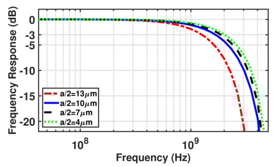 Figure 7 demonstrates that a higher bandwidth is achieved by shrinking the distance between cathode dots because of the electron drift time reduction due to the shortening of the radial carrier drift distance and an increase in the electric field strength distributed across the detection zone. It is shown that the structures with an a/2 of 13, 10, 7, and 4 μm achieve the bandwidth of 1.25 GHz, 1.7 GHz, 1.85 GHz, and 2 GHz, respectively. Taking a closer look at the dependence of the bandwidth on the cathode dots distance, it can be seen that reducing the a/2 from 13 μm to 10 μm increases the bandwidth from 1.25 GHz to 1.7 GHz, while further reducing the distance provides less bandwidth improvement. This is due to the fact that in smaller structures, the a/2 is smaller than the depth of the structure, and hence the vertical carriers’ transition from the deep depth (12 μm) limits the bandwidth, and therefore a further reduction of cathode dot distance has less influence on the bandwidth.