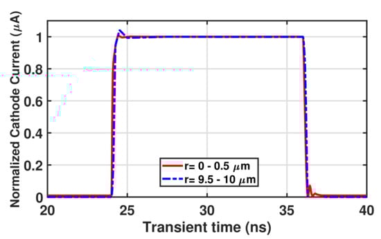 Since there are different drift carrier path lengths in the MD structure, we should care about the timing jitter performance evaluation of the MD-APD. However, accurately calculating the jitter based on the transit time is challenging due to the variations in the electric field strength along the carrier’s drift path. Therefore, we have conducted transient simulations under different conditions to estimate the largest possible jitter in the MD-APD. In the first simulation case, we have limited the incident light to the center of the structure (r = 0 to r = 0.5 μm), and therefore only the photogenerated carriers in the center reach the cathode with the shortest drift length. As a result, the rise time of the transient response corresponds to the shortest carrier transit time. The transient response (Figure 8) for this condition shows a rise time of 160 ps. In the second simulation case, we have limited the light irradiation to the edge of the half diagonal of the MD diode (r = 9.5 μm to r = 10 μm; analogously to the frequency response simulations of the MD structure above), resulting only in the photogenerated carriers with the longest drift path reaching the cathode. Accordingly, the rise time of the transient response corresponds to the longest carrier transit time. A rise time of 240 ps is obtained from the transient response results in this condition (Figure 8). The difference between these two values provides an estimation of the maximum jitter in the MD-APD, which is approximately 80 ps.
