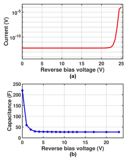Figure 9b illustrates the capacitance of the MD-APD, measured with an LCR meter Agilent 4284A at different reverse bias voltages with a frequency of 1 MHz and an ac amplitude of 100 mV. To subtract the effect of pad capacitance and measurement cables, the measurement was calibrated with an open structure (same pad size and metal track used for the MD-APD) on the same wafer.